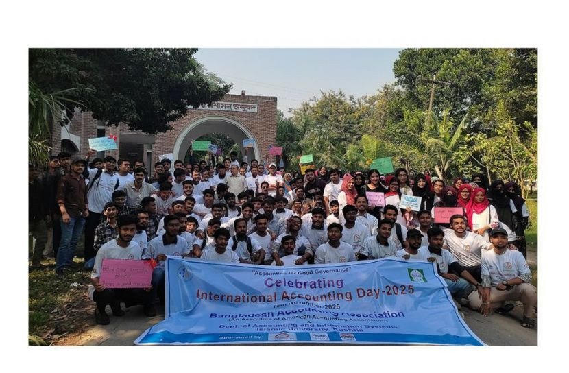 ইসলামী বিশ্ববিদ্যালয়ে (ইবি) বর্ণাঢ্য অনুষ্ঠানের মধ্য দিয়ে পালিত হয়েছে আন্তর্জাতিক হিসাববিজ্ঞান দিবস। বিশ্ববিদ্যালয়ের অ্যাকাউন্টিং অ্যান্ড ইনফরমেশন সিস্টেম বিভাগ বিশ্বের বিভিন্ন দেশের সহযোগিতায় দিবসটি পালন করে। সোমবার (১০ নভেম্বর) সকাল ১০টায় ব্যবসায় প্রশাসন অনুষদের সামনে এক আনন্দ র্যালির আয়োজন করা হয়। র্যালিটি পুনরায় ক্যাম্পাসের প্রধান সড়ক প্রদক্ষিণ করে অনুষদ ক্যাম্পাসে গিয়ে শেষ হয়। সমাবেশে উপস্থিত ছিলেন বিশ্ববিদ্যালয়ের কোষাধ্যক্ষ প্রফেসর ড. মোহাম্মদ জাহাঙ্গীর আলম, হিসাব ও তথ্য প্রযুক্তি বিভাগের চেয়ারম্যান ড. আব্দুস সবুর, সাবেক চেয়ারম্যান প্রফেসর ড.জাকির হুসাইন, প্রফেসর ড.মিজানুর রহমান, প্রফেসর ড.আবু সিনা, প্রফেসর ড.অরবিন্দ সাহাসহ বিভাগের শিক্ষক ও দুই শতাধিক শিক্ষার্থী উপস্থিত ছিলেন। আবদুস সবুর, বিভাগের চেয়ারম্যান অধ্যাপক ড. তিনি বলেন, ‘হিসাব দিবস পালন করা হয় মূলত অ্যাকাউন্টিং পেশার সঙ্গে যুক্ত ব্যক্তিদের উৎসাহিত করার জন্য। বিভিন্ন ইউরোপীয়-আমেরিকান অ্যাসোসিয়েশন যেমন ACCA, AICPA ইত্যাদি এই দিনটিকে গুরুত্বের সাথে উদযাপন করে। এর উদ্দেশ্য পেশাটিকে আরও মর্যাদাপূর্ণ করা এবং নতুন প্রজন্মকে এই পেশার প্রতি আকৃষ্ট করা। দিনব্যাপী অনুষ্ঠানের মধ্যে ছিল শিক্ষক-শিক্ষার্থীর কথোপকথন, আলোচনা এবং ছবি তোলা, যা পুরো ক্যাম্পাসকে উৎসবমুখর করে তুলেছিল। আমার বাংলা/আরএ(ট্যাগস্টোঅনুবাদ)বাংলাদেশ(টি)নিউজ