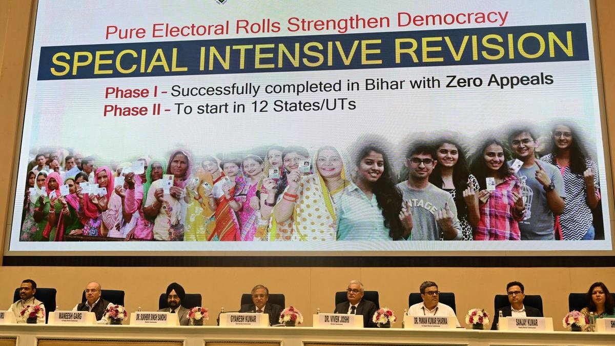 প্রধান নির্বাচন কমিশনার জ্ঞানেশ কুমার এবং নির্বাচন কমিশনার সুখবীর সিং সান্ধু এবং বিবেক যোশির সাথে 27 অক্টোবর, 2025 তারিখে নয়া দিল্লির বিজ্ঞান ভবনে বিভিন্ন রাজ্যে ভোটার তালিকার বিশেষ নিবিড় পর্যালোচনা বাস্তবায়নের বিষয়ে একটি সংবাদ সম্মেলনে বক্তব্য রাখেন। ছবির উৎস: পশ্চিমবঙ্গের সুশীল কুমার ভার্মা