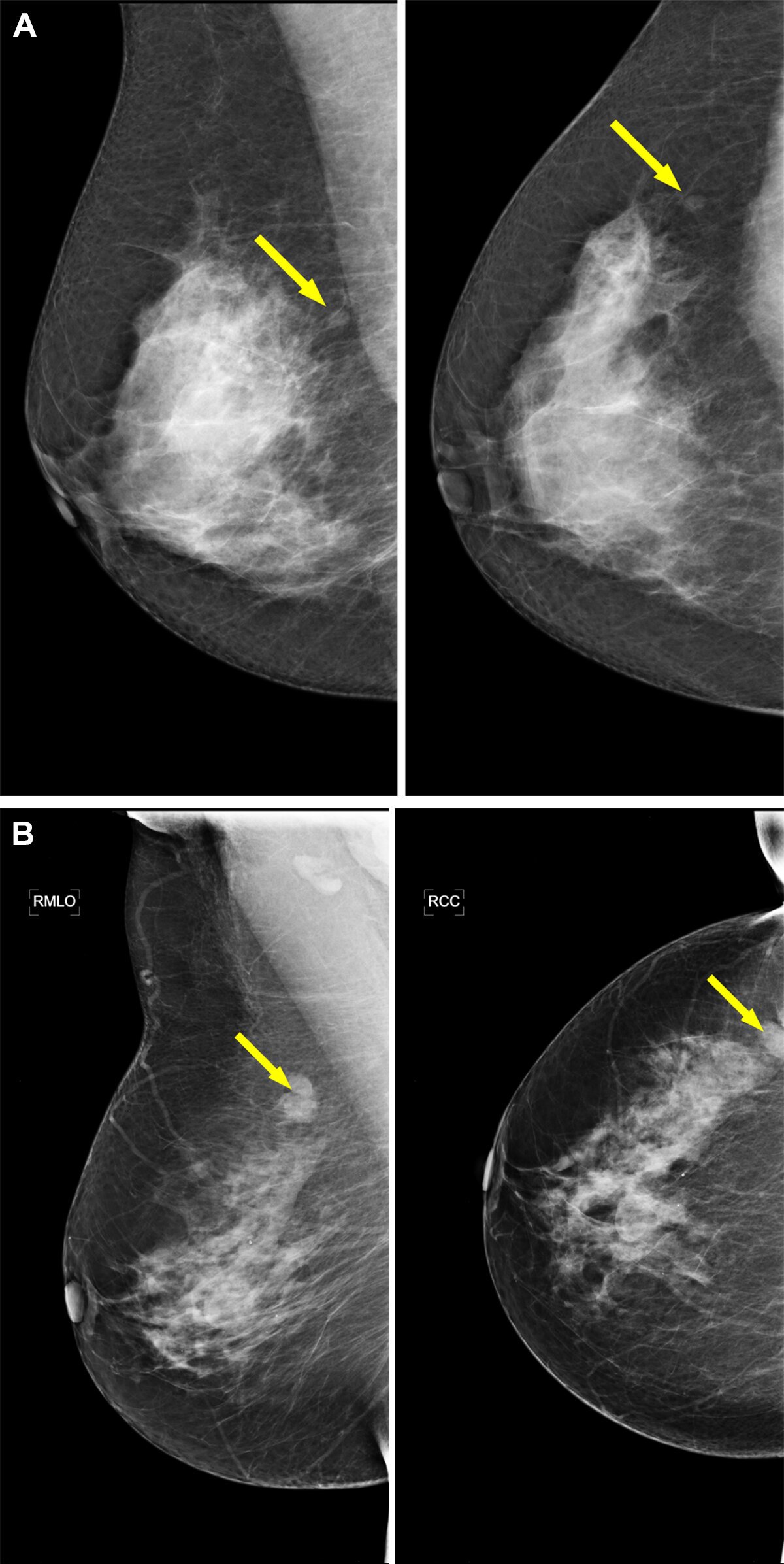একটি আক্রমণাত্মক ড্যাক্টাল কার্সিনোমা (তীর) সহ ম্যামোগ্রামগুলি স্ক্রিনিংয়ের উদাহরণ যেখানে মহিলাদের একটি এআই-রিডিং-কেবল কৌশল দিয়ে স্মরণ করা হত না। যাইহোক, এই পরীক্ষাগুলি সবচেয়ে সন্দেহজনক অঞ্চলের ম্যালিগেন্সি (পিওএম) স্কোরের গড় সম্ভাবনার এনট্রপির এআই অনিশ্চয়তার স্কোরের উপর ভিত্তি করে একটি হাইব্রিড রিডিং কৌশলতে রেডিওলজিস্টদের দেখানো হত। উভয় পরীক্ষার জন্য, প্রভাবিত স্তনের মধ্যযুগীয় তির্যক (বাম) এবং ক্র্যানিওকাডাল (ডান) ভিউগুলি দেখানো হয়েছে। (ক) একটি 67 67 বছর বয়সী মহিলার চিত্রগুলি যাকে প্রত্যাহার করা হয়েছিল কারণ উভয় রেডিওলজিস্ট স্তন ইমেজিং রিপোর্টিং এবং ডেটা সিস্টেম (দ্বি-রেড) 0 হিসাবে ডান স্তনকে স্কোর করেছিলেন। এআই মডেল দ্বারা পরীক্ষাটি পড়তে পারলে মহিলাটিকে স্মরণ করা হত না, যা পিওএম স্কোরকে ৪০ এর স্কোর নির্ধারণ করেছিল, তবে পূর্বাভাসটি একটি নিরীক্ষা পরিমাণের সাথে শ্রেণিবদ্ধ করা হত। (খ) একটি 63৩ বছর বয়সী মহিলার চিত্রগুলি যাকে প্রত্যাহার করা হয়েছিল কারণ উভয় রেডিওলজিস্ট দ্বি-র্যাডস হিসাবে ডান স্তনকে স্কোর করেছিলেন। এআই মডেল দ্বারা পরীক্ষাটি পড়তে পারলে মহিলাটিকে স্মরণ করা হত না, তবে ভবিষ্যদ্বাণীটি 0.98 এর অনিশ্চিত পরিমাণের সাথে অনিশ্চিত ভবিষ্যদ্বাণী হিসাবে শ্রেণিবদ্ধ করা হবে। ক্রেডিট: উত্তর আমেরিকার রেডিওলজিকাল সোসাইটি (আরএসএনএ)