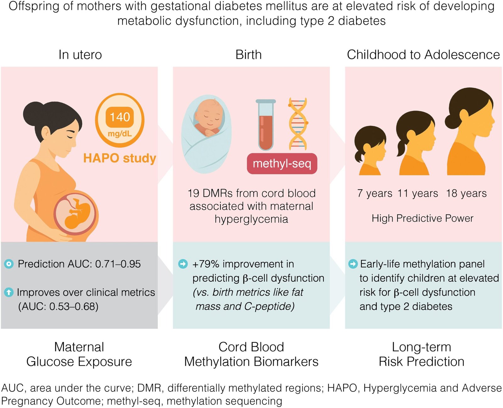 গর্ভাবস্থায় গর্ভকালীন ডায়াবেটিস বা উচ্চ রক্তে শর্করার সাথে জন্মগ্রহণকারী মায়েদের কাছ থেকে জন্মগ্রহণকারী শিশুদের কাছ থেকে কর্ড রক্তে ডিএনএ বিশ্লেষণ করে গবেষকরা প্রাথমিক এপিগনেটিক চিহ্নিতকারীদের চিহ্নিত করেছেন যা ডায়াবেটিসের বিকাশের আগে 18 বছর পর্যন্ত ইনসুলিন প্রতিরোধের এবং বিটা-কোষের অকার্যকরতার পূর্বাভাস দেয়।